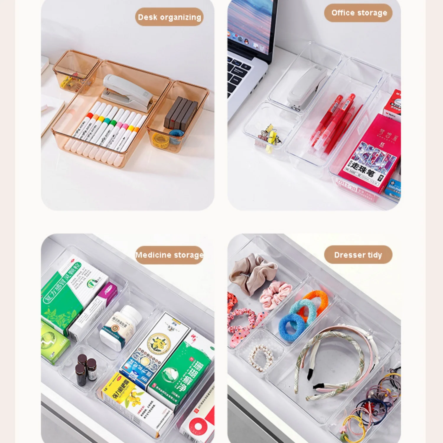 Make Everything Organized -- These clear versatile drawer dividers trays are perfect for any place in your home. Fit all kinds of drawers, such as vanity / bathroom / kitchen / office drawers/ craft room, ideal for organizing cosmetics, makeup tools, hair accessories, jewelry, pins, office supply, craft supplies, utensils, etc.