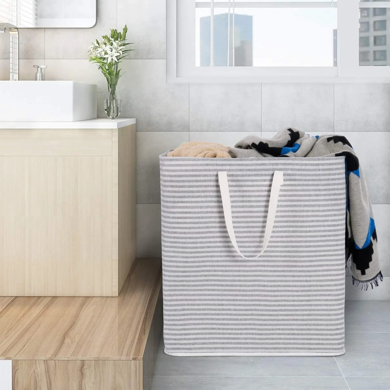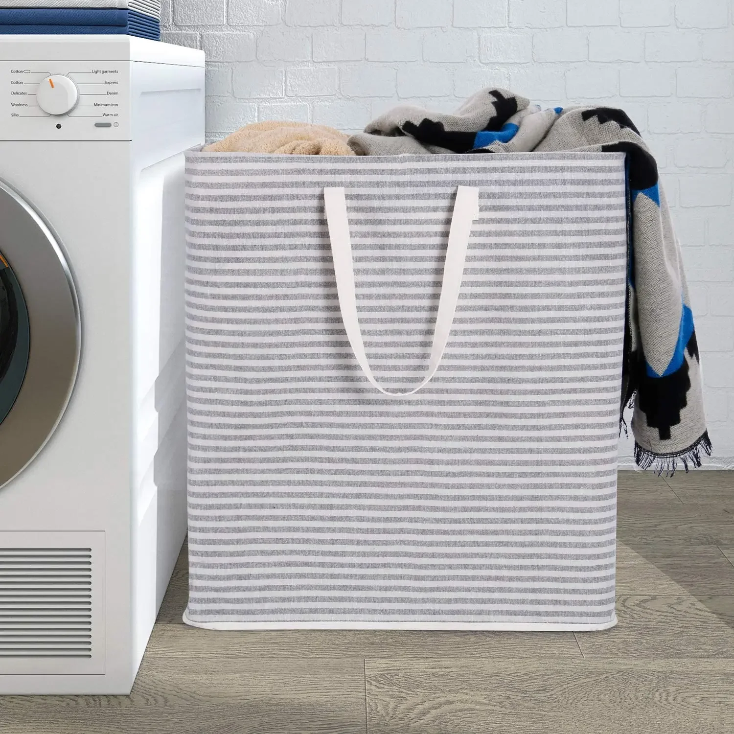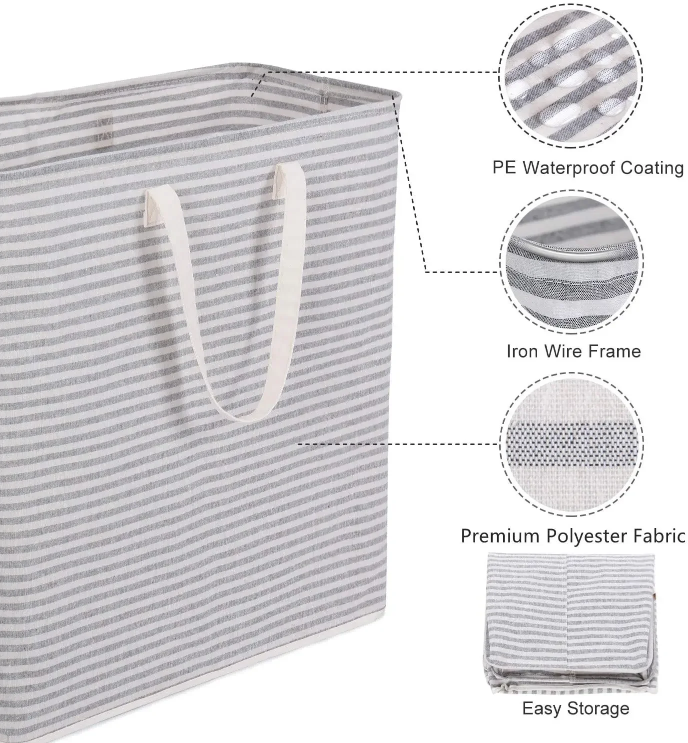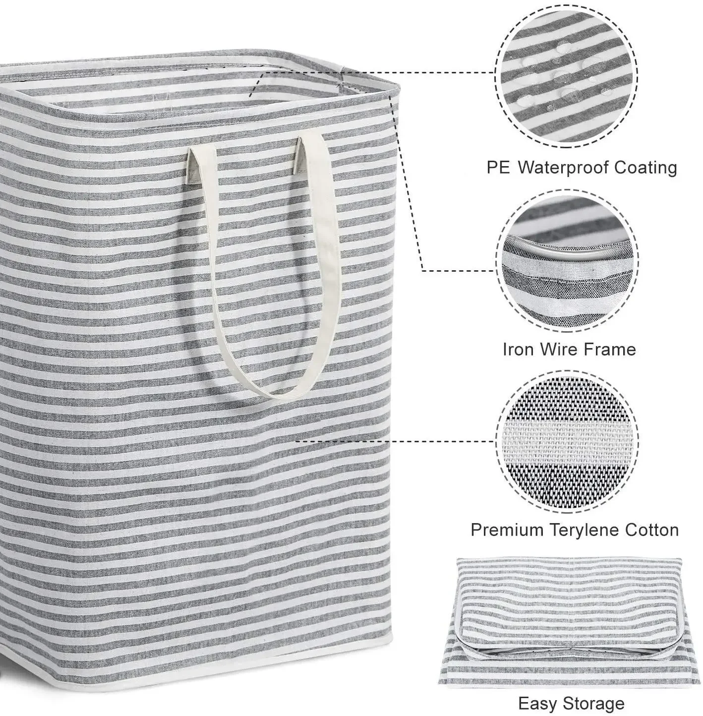 Lightweight Materials: The clothes hamper is made from thick polyester, the interior features PE waterproof coating to keep stored items dry, it is lightweight yet durable, makes it easy to carry up and down stairs, laundry destination, etc. Do not use washer and dryer to wash the laundry hamper, the PE coating might be destroyed.