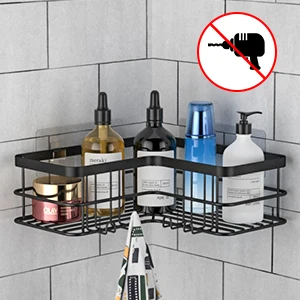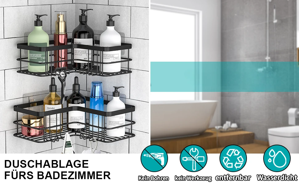 Duschablage Ohne Bohren 2 Stück - Duschregal Ecke mit Haken, Duschablage Edelstahl für Badezimmer und Küche (Schwarz)