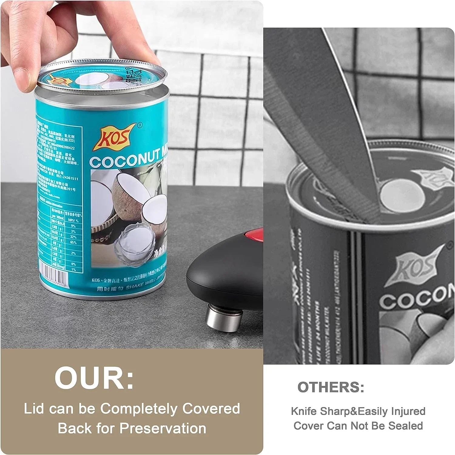 【Can Opener Smooth Edge】electric can opener made of food-grade material, The blade of the can opener electric cuts along the side of the lid without touching the food inside, leaving no sharp cuts and high safety!