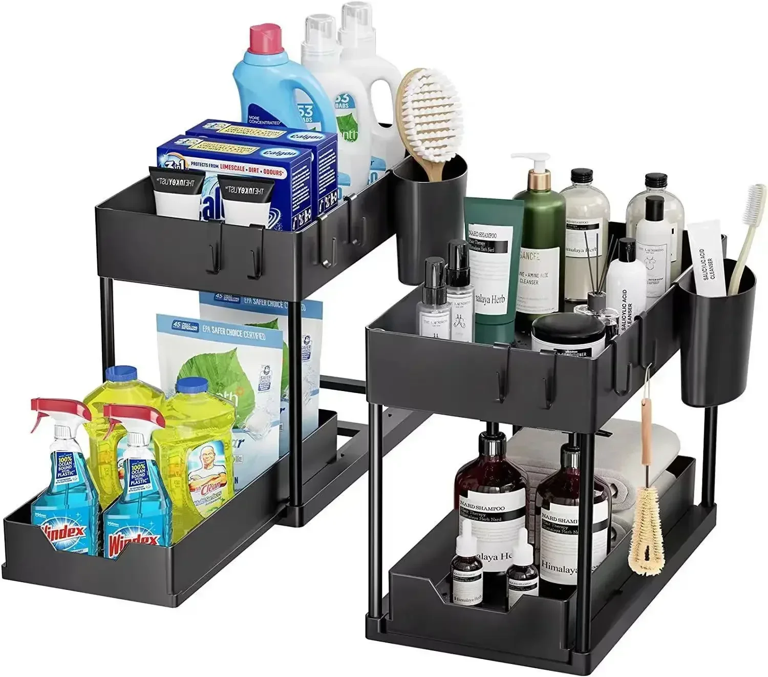 2 Tier Under Sink Organizer Sliding Cabinet Basket Organizer Storage Rack with Hooks Hanging Cup Bathroom Kitchen Organizer