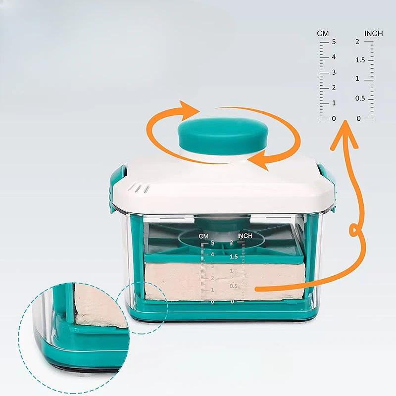 3. Top Pouring Port: The tofu presser drainer allows you to easily pour out pressed water with the convenient pouring spout on top, maintaining the shape of tofu blocks without reopening the lid.