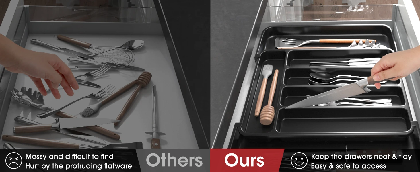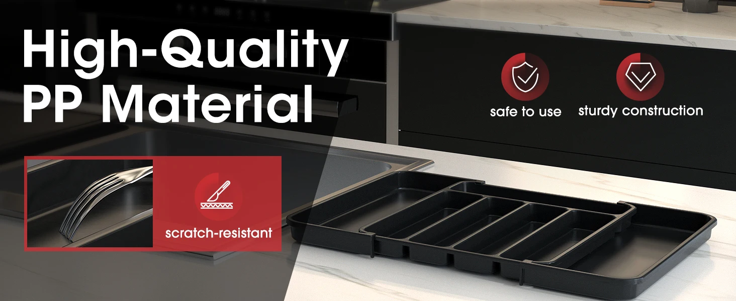 drawer organizer for kitchen utensils is crafted from premium PP material that is BPA-free and durable for use. Just rest assured that it can guarantee the safety of all your utensils, silverware, and flatware. Cleaning is as easy as a - simply rinse with water or wipe with a damp cloth.