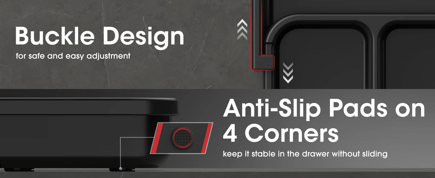 Anti-sliding pads on all four corners keep items securely in place, preventing any unwanted sliding under the dividers. The buckle design allows smooth sliding and easy adjustment while preventing the dividers run off the. Enjoy a seamlessly organized experience with AUJEN utensil holders!